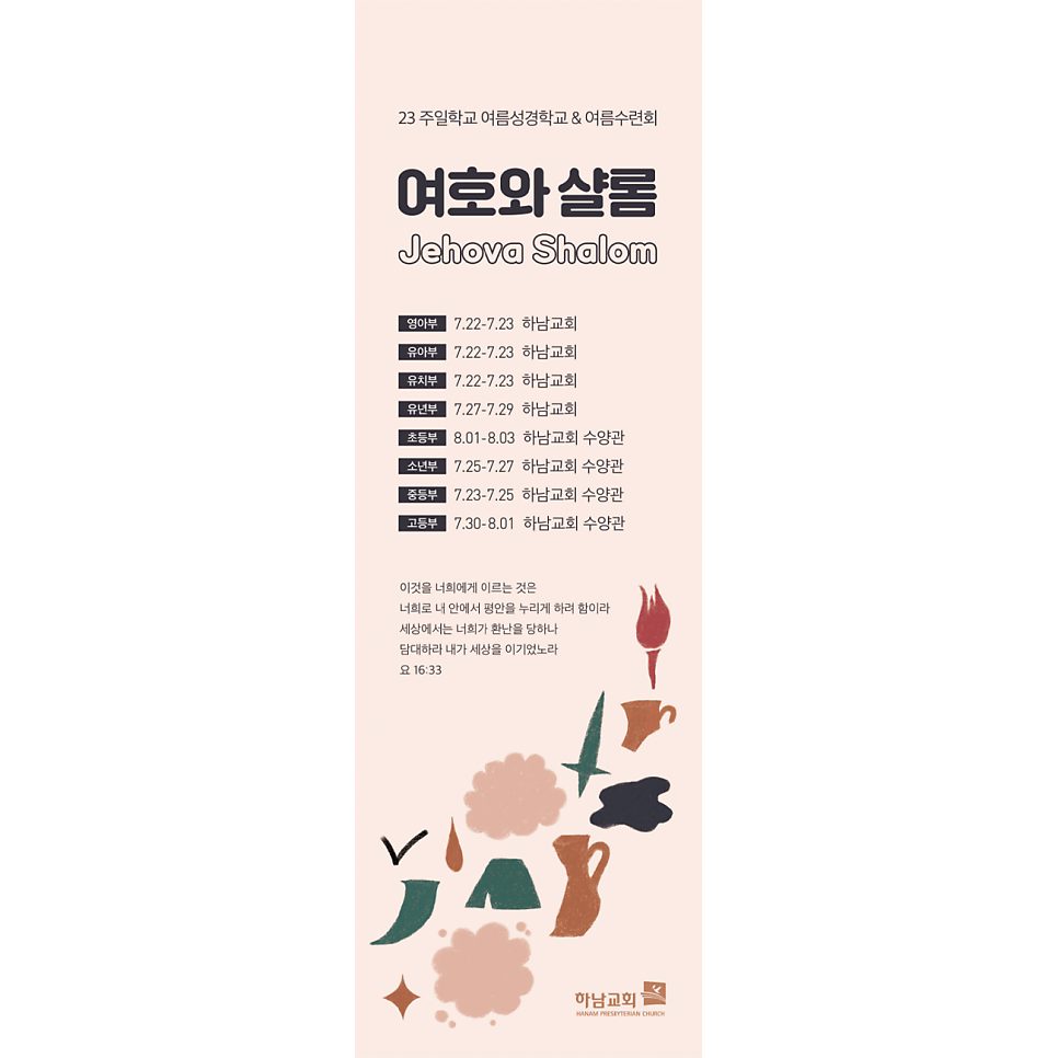 하남교회 2023년 여름 성경학교와 수련회 홍보물을 제작했습니다. 주제는 ‘여호와 샬롬’. 사사기 6장 24절에 등장하는 기드온의 제단 이름입니다. 여호와께서 평강이시다, 라는 뜻입니다. 전쟁과 두려움의 한가운데서 받은 평화. 그 메시지를 여름 성경학교 주제로 삼은 것입니다. 포스터 두 종과 현수막 한 종으로 구성했습니다. 전 교육 부서가 같은 디자인 계열을 공유하는 방식이라, 영아부부터 청소년부까지 하나의 흐름으로 연결됩니다. 부서별로 따로 제작하는 방식도 있지만, 전 부서를 하나의 주제 아래 묶으면 행사 전체의 결이 달라집니다. 규모 있는 교회 행사에서는 이 통일감이 중요합니다.