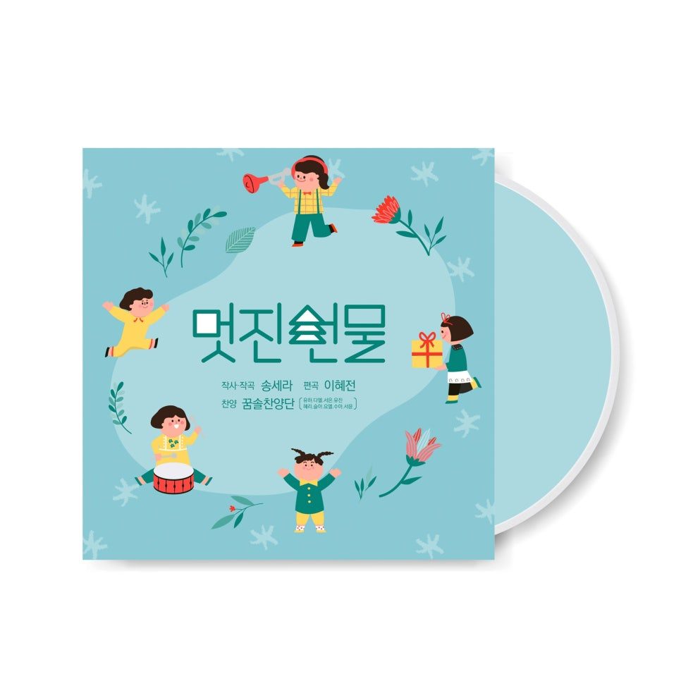 멋진선물. 어린이 찬양 앨범의 제목입니다. 밝은 하늘색 배경에 파스텔톤 캐릭터와 꽃들이 함께 어우러진 CD 커버 디자인입니다. 색이 많아도 시선은 정돈됩니다. 파스텔 특유의 낮은 채도가 전체를 잡아주기 때문입니다. 아이들 앨범에서 중요한 게 무엇인지 생각했습니다. 바로 읽히고, 바로 기억에 남는 것. 귀여운 캐릭터 일러스트와 간결한 타이포그래피가 그 답이었습니다. 복잡한 요소보다 명확한 인상이 더 오래 남습니다. 찬양을 부르는 아이들이 커버를 보면서 노래가 기대되는 것. 그게 이 디자인이 목표로 한 지점입니다.